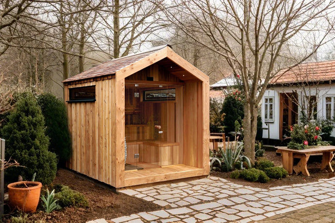 Our Solvana saunas are designed with a focus on the view. They feature a full-height glass wall, a frameless hinged door, and post-box style windows along the sides, creating a panoramic effect from the top tier. This design lets you fully enjoy the peacefulness of your surroundings, whether it's your garden or a wider landscape. The small porch adds privacy and shelter while framing the view.